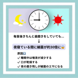 夜寝ている間にお口の中の細菌は約30倍に増えると言われています⚠️